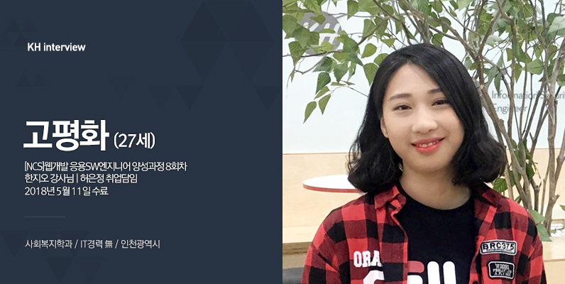 안녕하세요! 27살 고평화 입니다. 저는 사회복지학과를 전공했고요. KH정보교육원에서 프로그래밍을 처음 배우게 되었어요.