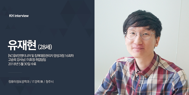 안녕하세요! 컴퓨터정보공학과 졸업생 유재현입니다. 대학교 4학년 때 ‘디지털 포렌식’이라는 과목에 흥미를 느껴서 이 분야에 대해 더욱 자세히 배우고, 취업하기 위해 KH정보교육원에 오게 되었어요.