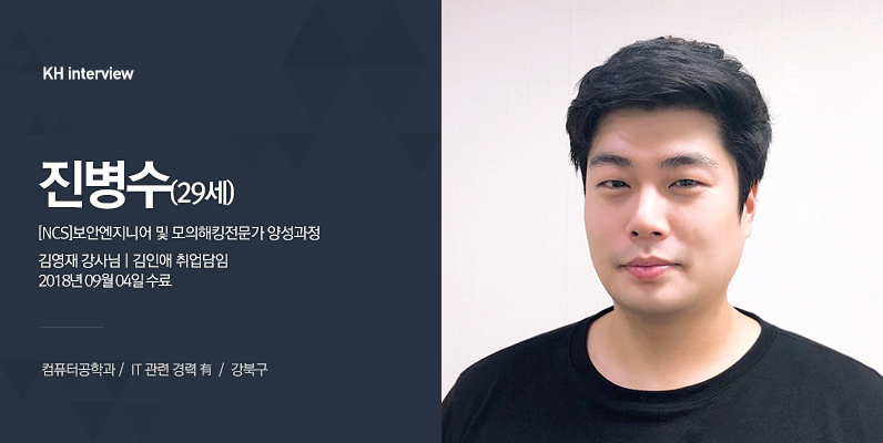 안녕하세요! 보안엔지니어 및 모의해킹전문가 과정 수료를 앞둔 29살 진병수입니다. 저는 컴퓨터공학과를 전공했어요.