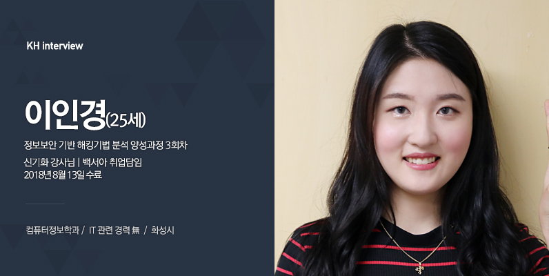 정보보안에 대해 배우려고 검색했는데 KH정보교육원에 대한 후기가 좋아서 오게 됐습니다. 실제 교육해본 수료생들의 교육만족도와 취업 성공기에 문의를 남기게 되었죠. 이후 상담을 통해 KH정보교육원에 더욱 신뢰가 가서 등록하게 됐습니다. 또, 집에서 가까워 KH에 오게 됐습니다. (웃음)