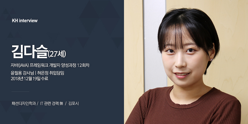 안녕하세요. 27살 김다슬입니다. 저는 은행에서 일하다가 IT분야에 관심이 생겨서 KH에 오게 됐습니다.