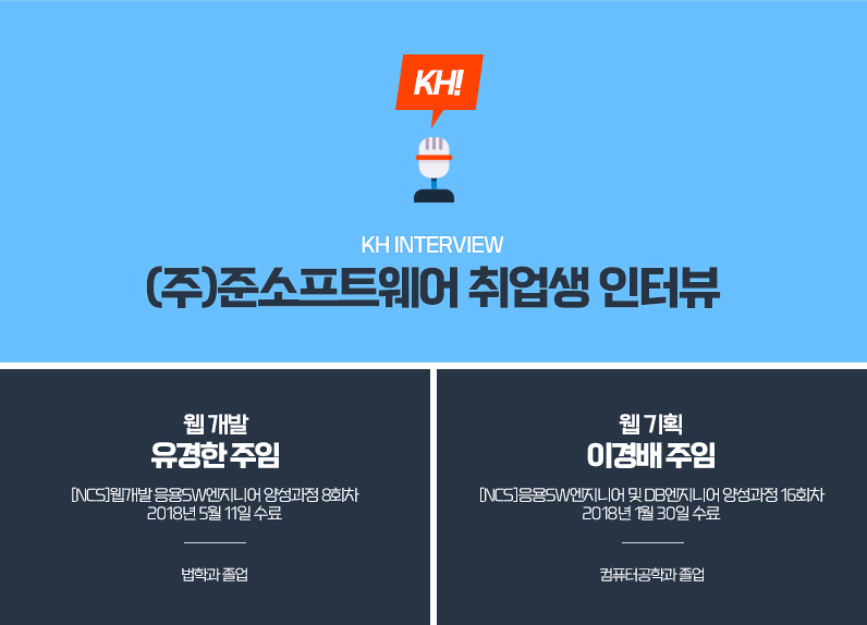저희 KH정보교육원은 ‘실전대비면접’ 뿐만 아니라 현업에서 근무하는 실무진의 ‘직무특강’과 취업한 선배님을 초청해 후배들과 직접 만나 선배의 경험을 듣고 질문도 하는 ‘선배와의 대화’도 진행하고 있는데 시간이 되시면 두 분도 꼭 모시고 싶어요.