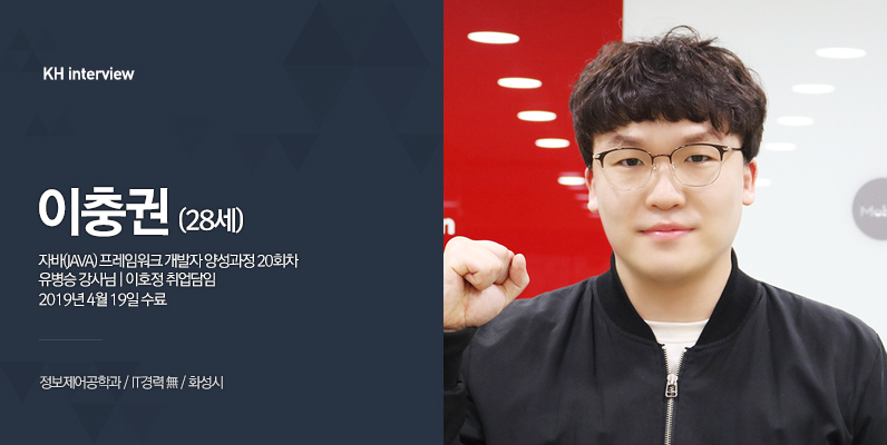 안녕하세요. 저는 28살 이충권이고 정보제어공학을 전공했습니다. 장교 전역 후에 개발자를 목표로 교육원을 찾던 중 친구의 추천으로 KH정보교육원을 알게 되었습니다.