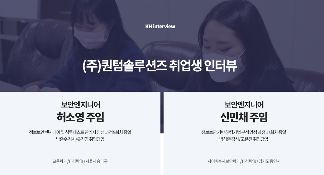 오늘은 KH정보교육원을 수료하고 현업에서 멋지게 활약 중이신 선배님들을 찾아가 솔직한 이야기를 듣는 자리를 가졌습니다. 유무선 네트워크 인프라 보안 솔루션과 유지보수 서비스를 제공하는 IT전문기업인 퀀텀솔루션즈의 두 선배님인데요. 기술지원팀 허소영 주임님과 솔루션사업팀 신민채 주임님과의 인터뷰 현장으로 함께 가 보실까요?