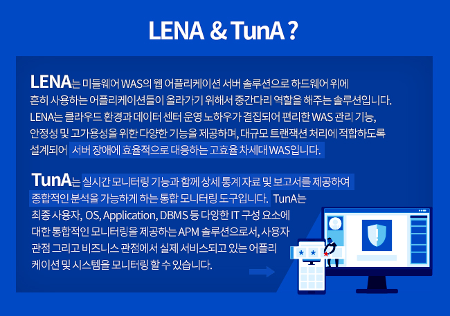 신민채 | 저는 WEB WAS 쪽을 하고 있는데요 LENA(레나)와 TunA(튜나) 등 솔루션 관련 업무를 담당하고 있습니다. |