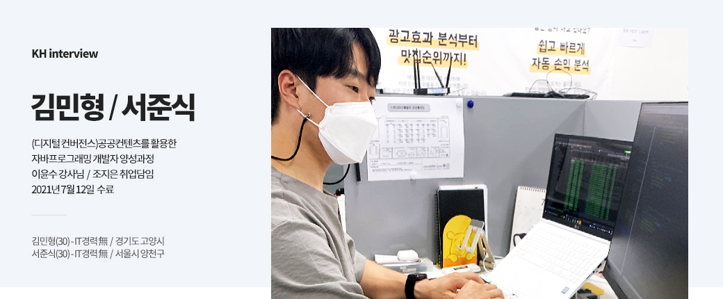 김민형 | 저 같은 경우는 웹 개발을 하고 싶었고 학원을 알아보니 자바 언어를 사용한 커리큘럼이 많았습니다. 자바가 오래된 언어인 만큼 다양한 정보 사이트가 많아 어려움을 겪을 때마다 검색하여 문제를 해결하기 수월하다 생각해 선택했습니다. |