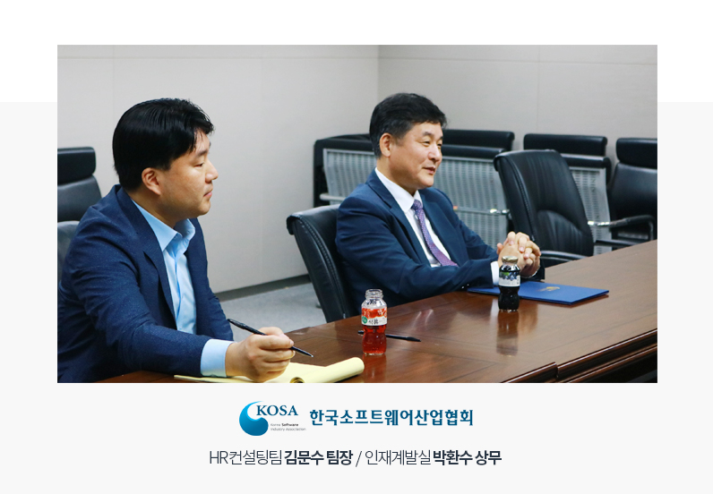 안녕하세요. 저는 KOSA HR컨설팅팀의 김문수 팀장이라고 합니다. 저희 한국소프트웨어산업협회는 1988년 설립이 되어 만 30년이 넘는 역사를 갖고 있는 소프트웨어 산업의 대표적인 단체입니다. 과학기술정보통신부에서 소관하고 있는 소프트웨어산업진흥법상의 설립근거가 명시되어 있는 법정단체이죠. KOSA소속의 회원사로는 9,500개 이상을 갖고 있습니다. 규모에 걸맞게 여러 가지 활동들을 하고 있는데요. 소프트웨어와 관련된 법 제도를 연구하고 정부측에 개선이 필요한 사항은 건의를 하여 회원사의 권익을 보호하고 있습니다. 또한 기업체 간에 공정한 거래를 할 수 있도록 생태계 개선 활동, 그리고 인력에 대한 양성 및 채용지원 활동도 하고 있습니다.