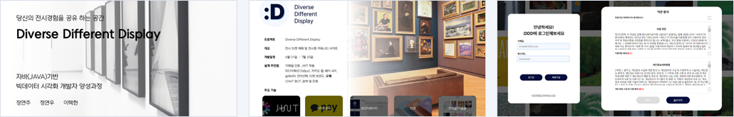 - 전시 API 연동을 통해 한눈에 알아볼 수 있도록 전시 서비스 제공 - 카카오 페이 API 연동을 통한 편리한 결제기능 - 다이어리(평점, 한줄평)을 통해 마이페이지 내 나만의 공간 제공 - 자유 게시판을 통해 회원들간에 정보 공유 커뮤니티 공간 제공 |