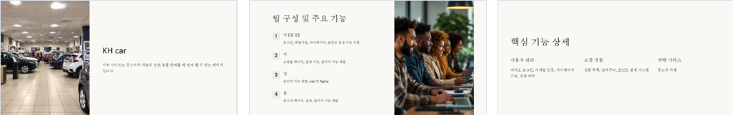 인증 및 회원 관리 - 로그인/카카오 로그인 및 로그아웃 - 회원가입 - ID/PW 찾기 - 이메일 인증 - 주소 검색 - 마이페이지 기능 (포인트 충전, 구매 내역 및 렌트카 예약 내역 확인, 프로필 수정, 회원 탈퇴) 쇼핑몰 기능 - 상품 목록 및 필터링 - 상품 상세 정보 표시, 장바구니 추가, 바로 구매 기능 - 장바구니 조회, 수량 관리, 내역 저장 - 포인트 결제 지원, 재고 감소 처리, 트랜잭션 관리, 결제 내역 저장 - 결제 내역(명세서) 조회 - 쇼핑몰 관리자 기능 (데이터 삽입, 수정, 삭제, 조회, 검색) 렌트카 기능 - 렌트카 상품 목록 출력 및 상세 정보 표시 - 렌트카 예약 및 결제 - 포인트 결제 지원, 결제/예약 내역 저장 - 렌트카 관리자 기능 (데이터 삽입, 수정, 삭제, 조회, 검색) 중고차 기능 - 상품 목록 & 필터링 & 페이징 - 상품 상세 정보 표시, 차량 설명 에디터, 결제 기능 - 차량 결제 완료 시 숨김 처리, 트랜잭션 관리, 결제 내역 저장 - 중고차 관리자 기능 (데이터 삽입, 수정, 삭제, 조회, 검색) - 전국 직영점 차량 조회 (지도(Map) 사용) 고객센터 - 메뉴얼 및 문의 게시판 |
