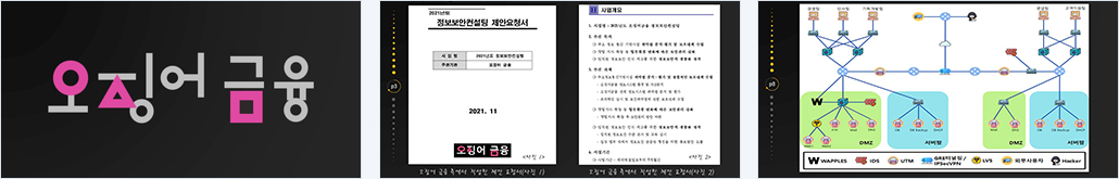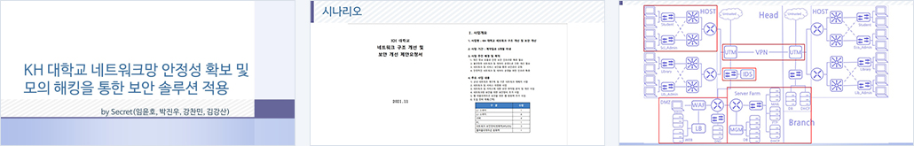 KH 대학이 외부로부터 공격을 받아 학생들의 개인정보가 유출되어 보안 인프라망 구축을 의뢰하였다. 추가적으로 내부 네트워크가 불안정하여 안정성 확보를 위한 설계도 의뢰하였다. Secret팀은 의뢰에 따라 이중화 구성 및 로드 밸런서를 추가하여 네트워크 안정성을 확보하고 모의 해킹을 통해 내부 서버들과 Web을 점검, IDS, WF, UTM 등 보안 솔루션을 도입하였다. 그리고 보안 솔루션을 통해 보안 관리 체계를 마련한다 |