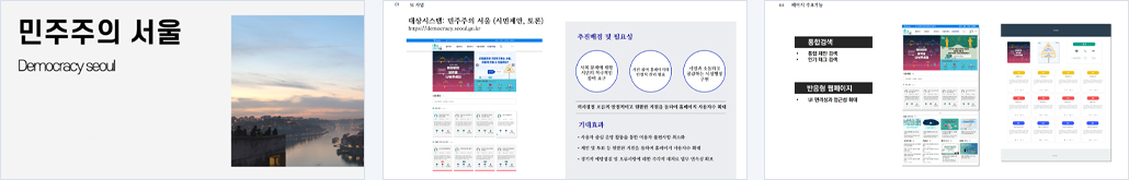 통합 검색 / 반응형 웹 페이지 / 회원가입 & 로그인 / 마이 페이지 / 시민 제안 - 목록 / 시민 제안 - 게시글 / 시민 토론 - 게시글 / 관리자 페이지 |