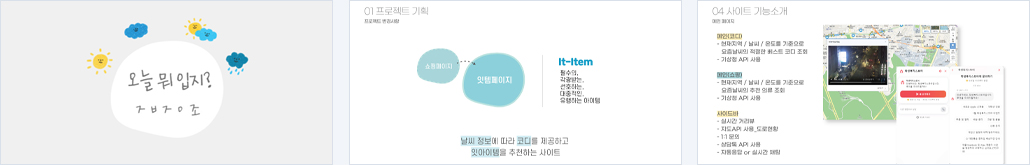 현재 지역/날씨/온도를 기준으로 베스트 코디 추천 및 의상 구매 기능 실시간 거리뷰 지도 API 사용 하여 도로현황 공유 1:1 문의 상담톡 API 자동응답 or 실시간 채팅 코디 페이지 베스트 코디 |