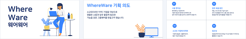 어디에서나 사용할 수 있는 그룹웨어 라는 뜻으로 Where Ware라는 이름으로 만들었음. 소규모 기업을 대상으로 원활한 소통과 업무 활동에 필요한 기능을 갖춘 그룹웨어를 만들고자 하였음 사용 편이성, 업무 효율 증진, 소규모 기업에 최적화, 접근성 |