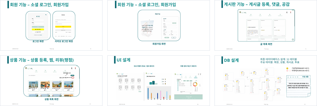 구현기능 | 회원 기능 - 회원 정보 등록 / 수정 / 삭제 - 소셜로그인 : 카카오 / 구글 상품 기능 - 상품 정보 등록 / 수정 / 삭제 - 상품 정보 검색 및 정렬 기능 - 상품 찜 / 리뷰 기능 커뮤니티 기능 - 게시글 + 게시글 등록 / 수정 / 삭제 / 조회 + 게시글 공감 기능 + 글 상세 네비게이터 바 - 댓글 + 댓글 등록 / 수정 + 댓글 공감 투표 기능 - 여행지 투표 등록 / 수정 여행 경비 계산 기능 - 인원수에 따라 1/N금액 계산 - 각 카테고리 별 금액 비율 산출 |