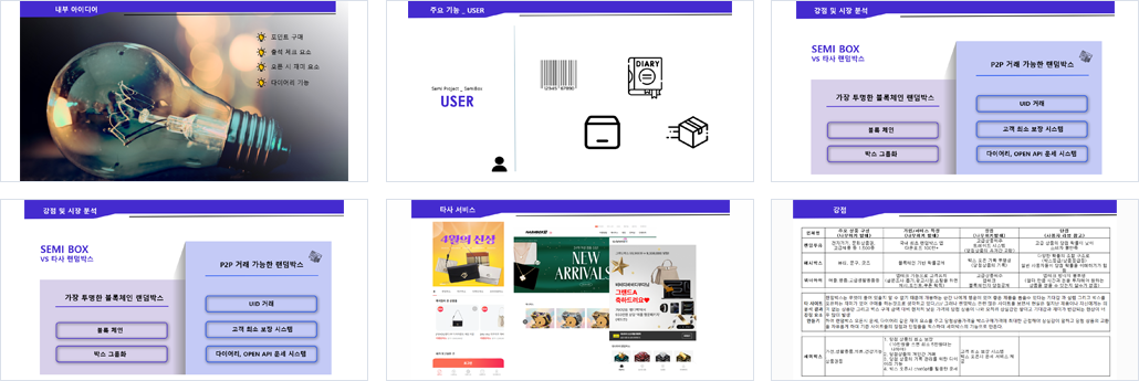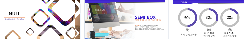 개요 | 랜덤한 확률의 박스를 구매해 오픈후 상품을 획득한 상품을 본인이 소유하거나 p2p방식을 이용한 상품 교환이 가능 한 웹 서비스임. 유저간 유기적인 상호작용이 가능하며, UUID를 기반으로 효율적인 데이터 관리가 가능한 비동기 통신 프로젝트 구현 |