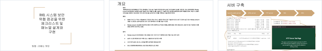 팀장/팀원 | 전**(팀장) : 1. 네트워크 - VMware 기반 가상환경 및 네트워크 구성 - 서버 및 클라이언트 Rocky Linux 8.10 OS 설치 - Apache 서버 설치 2. KISA 상세 가이드를 참조하여 Rocky Linux 8.10 버전 OS에서 취약점 점검 및 설정 후 기술 문서 작성 2-1. FTPusers 파일 설정 - vsFTP root 접속 차단 - vsFTP 접근 제어 설정 2-2. at 서비스 파일 소유자 및 권한 설정 - /usr/bin/at 파일 SUID 제거 - /etc/at.allow, /etc/at.deny 파일 수정 2-3. SNMP 서비스 구동 여부 및 Community String 설정 - SNMP 서비스 중지 - /etc/snmp/snmpd.conf 파일 수정 2-4. 로그온 시 경고 메세지 제공 - 서버 및 Telnet, FTP, SMTP, DNS 배너 설정 2-5. NFS 설정파일 접근 권한 설정 - /etc/exports 파일 소유자 및 권한 변경 2-6. expn, vrfy 명령어 제한 - SMTP 서비스 중지 - noexpn, novrfy 설정 2-7. Apache 웹 서비스 정보 숨김 - ServerTokens Prod, ServerSignature Off로 설정 2-8. 정책에 따른 시스템 로깅 설정 - /etc/rsyslog.conf 파일 수정 |