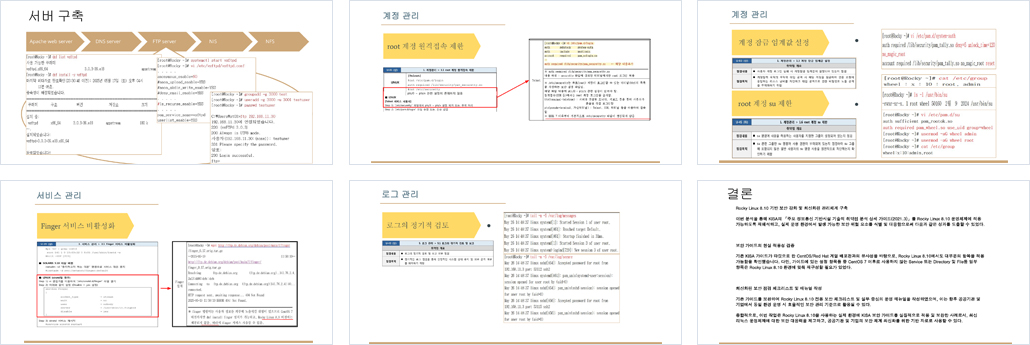 설계의 주안점 | 1. 침해사례를 반영한 실무형 보안 설정 - KISA에서 제시한 분석 및 평가 방법론을 기반으로 침해사례를 참고하여 보안 설정. - 각 보안 항목에 대해 “무엇을, 왜 해야 하는가”를 명확히 하여 이해도 및 현장 활용성 강화. 2. 서비스별 가상 환경 분리 및 통신 구현 - FTP, DNS, Apache, NFS, NIS 등 보안 취약점이 자주 발생하는 핵심 서비스를 별도 가상 머신에 구성하여 실습 환경을 구현. - NAT 환경(192.168.11.0/24) 내에서 A/B 클라이언트와의 양방향 통신을 통해 실제 운영 환경을 시뮬레이션. 3. 보안 원칙에 따른 계층별 접근 통제 - 계정 관리 → 파일 권한 → 서비스 제한 → 네트워크 방화벽 → 로그 및 추적 관리로 이어지는 계층별 보안 접근 방식 적용. 4. 표준화된 체크리스트 및 설정 가이드화 - 각 보안 항목별 점검 체크리스트와 설정 가이드 문서를 함께 제공하여 반복적 보안 점검 및 교육용 자료로 활용 가능. - 시스템 관리자 및 보안 담당자가 즉시 참고 가능한 문서화 형태로 구성 (스크립트 + 설명). 5. 보안 설정 미흡 시 발생 가능한 위협 시뮬레이션 - 보안 설정을 하지 않았을 때의 실제 침해 시나리오(예: 계정 탈취, 서비스 스니핑, 파일 손상 등)를 함께 제시. - 단순 설정이 아닌 설정하지 않을 경우의 리스크 인식을 유도하여 교육 및 실무 반영도 향상. |